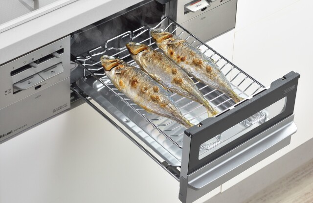 【両面焼き】グリルは水なし両面グリル。両面で焼き上げるため、魚をひっくり返す必要がなく、使用後の掃除も簡単!