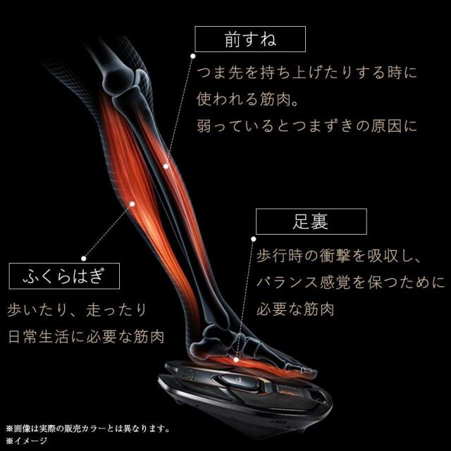 1日1回23分、本体の上に足を乗せると、EMSが足裏・前スネ・ふくらはぎを同時に刺激。歩行で使われる筋肉のトレーニングを、座ったまま手軽に行うことができます。